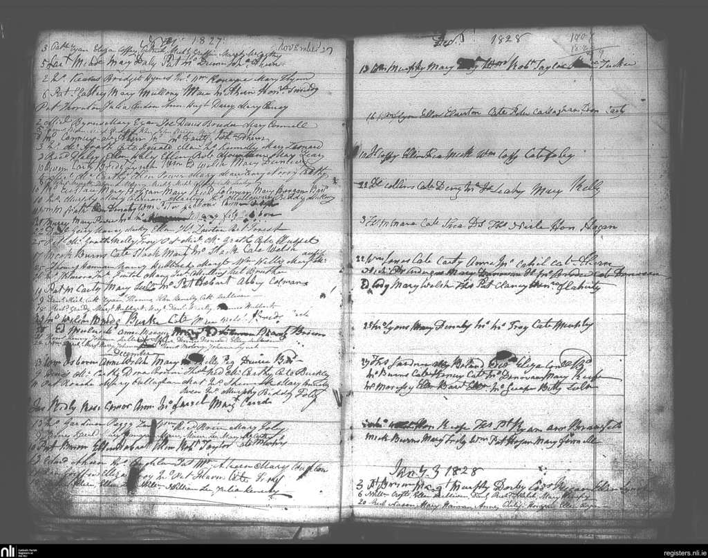 Youghal; County of Cork; Diocese of Cloyne. Baptisms, Nov. 1827 to Jan. 1828