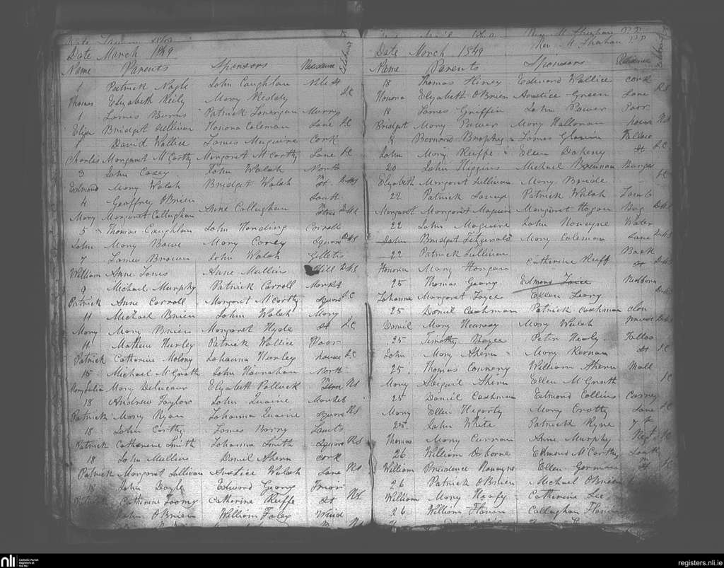 Youghal; County of Cork; Diocese of Cloyne. Baptisms, Mar. 1849