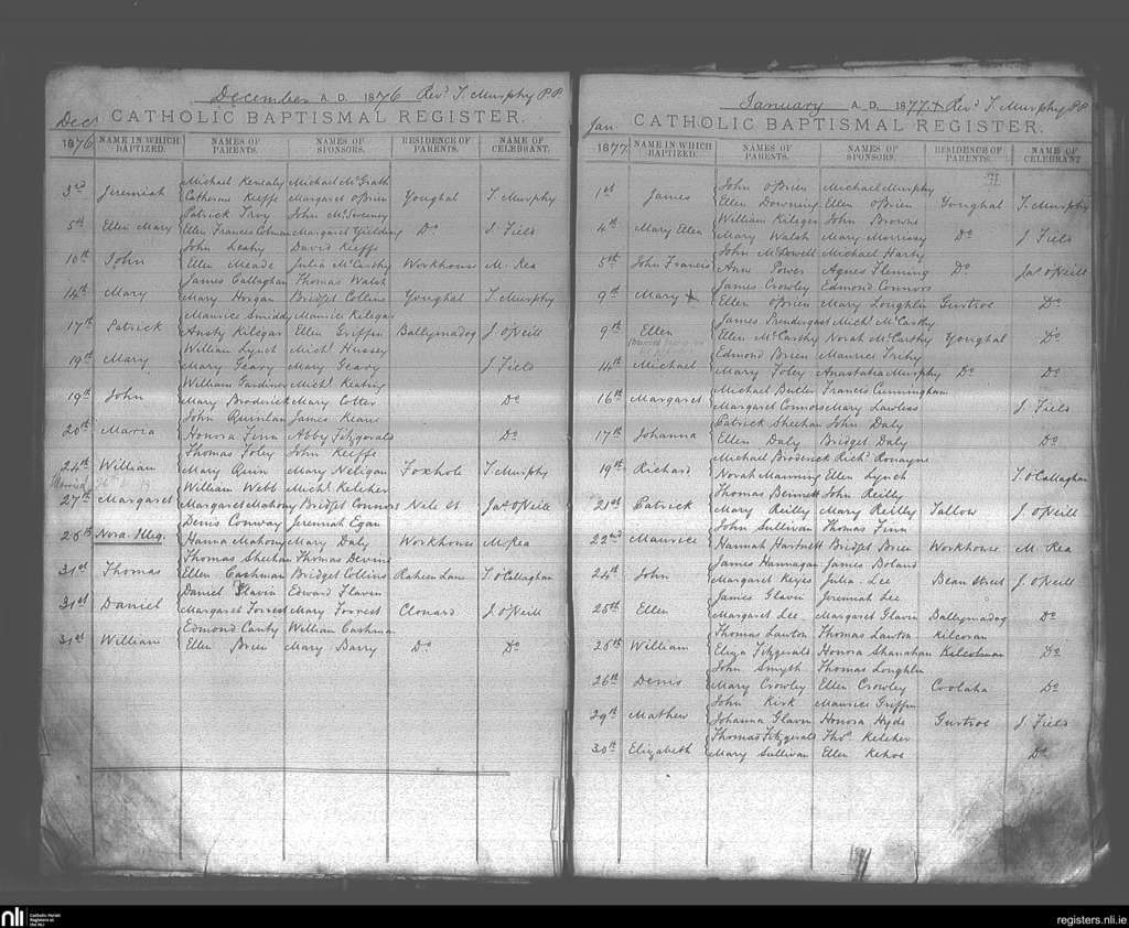 Youghal; County of Cork; Diocese of Cloyne. Baptisms, Dec. 1876 to Jan. 1877
