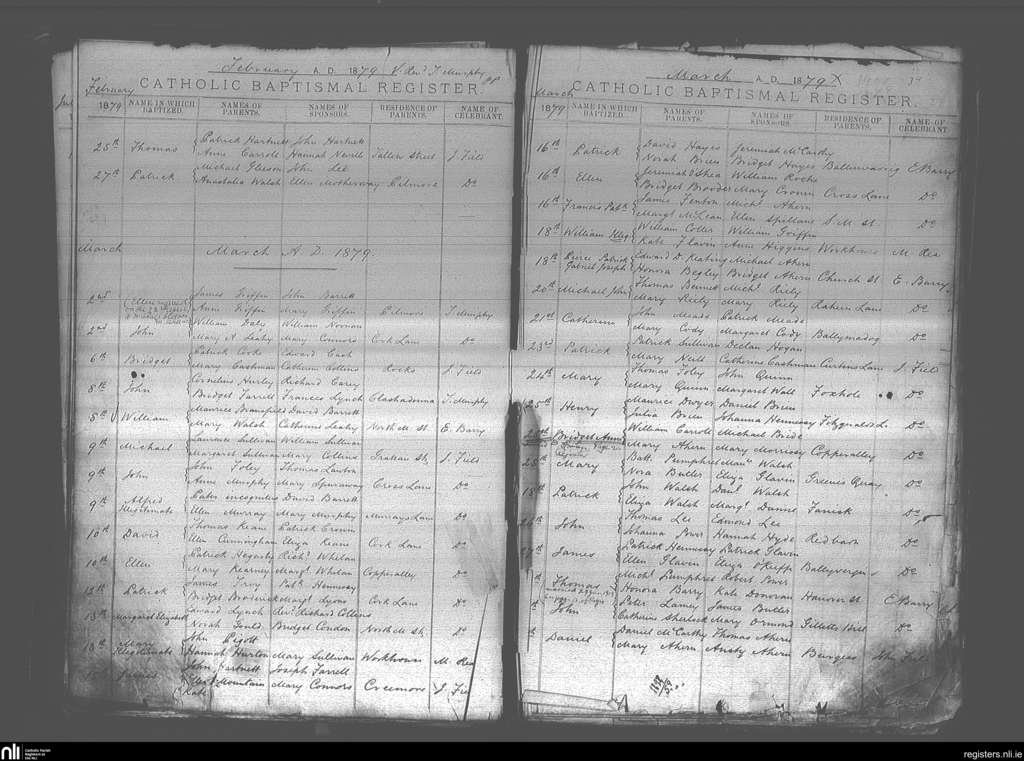 Youghal; County of Cork; Diocese of Cloyne. Baptisms, Feb. 1879 to Mar. 1879