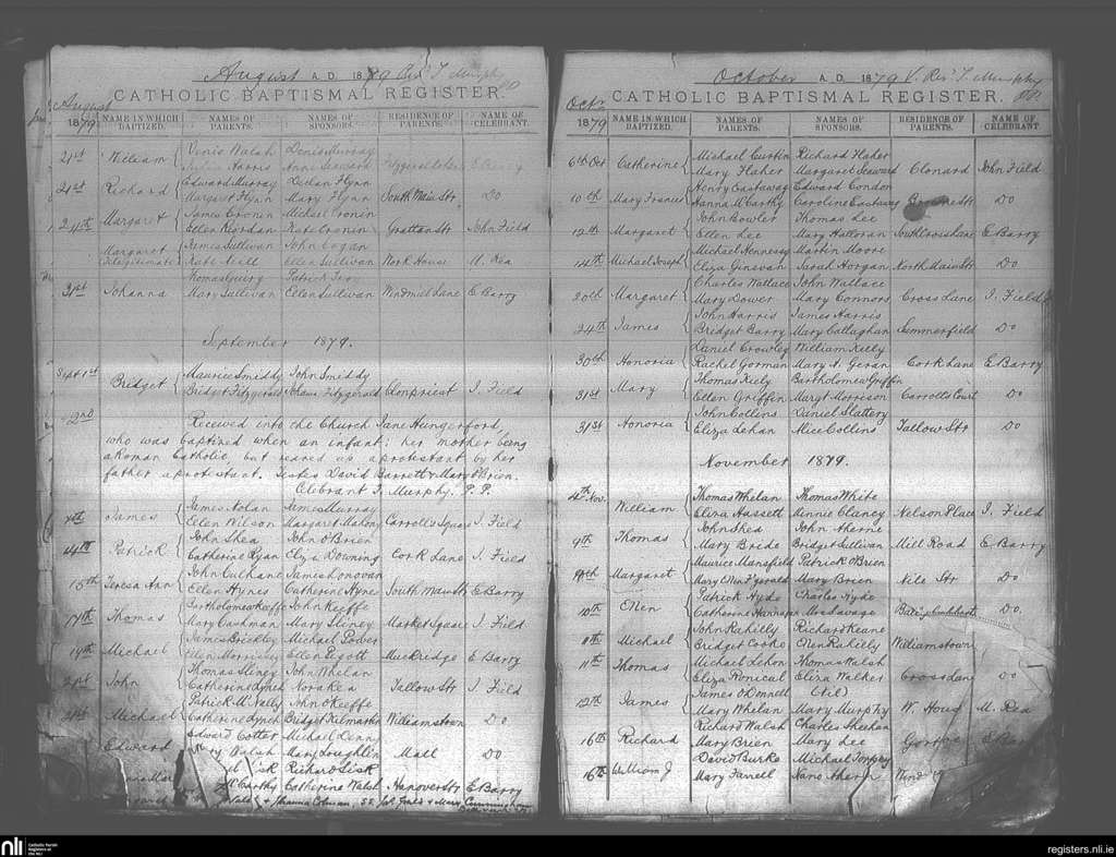 Youghal; County of Cork; Diocese of Cloyne. Baptisms, Aug. 1879 to Nov. 1879
