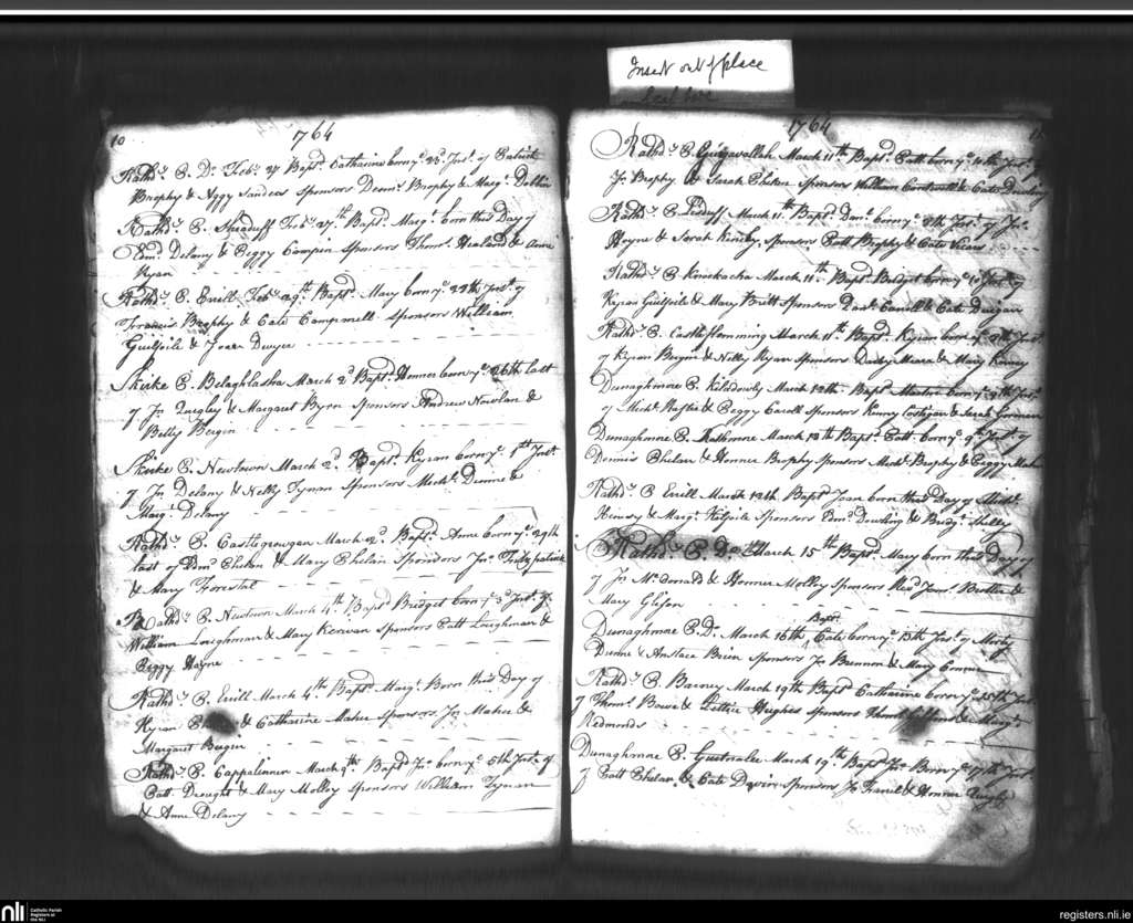 Rathdowney; County of Laois; Diocese of Ossory. Baptisms, Feb. 1764 to Mar. 1764