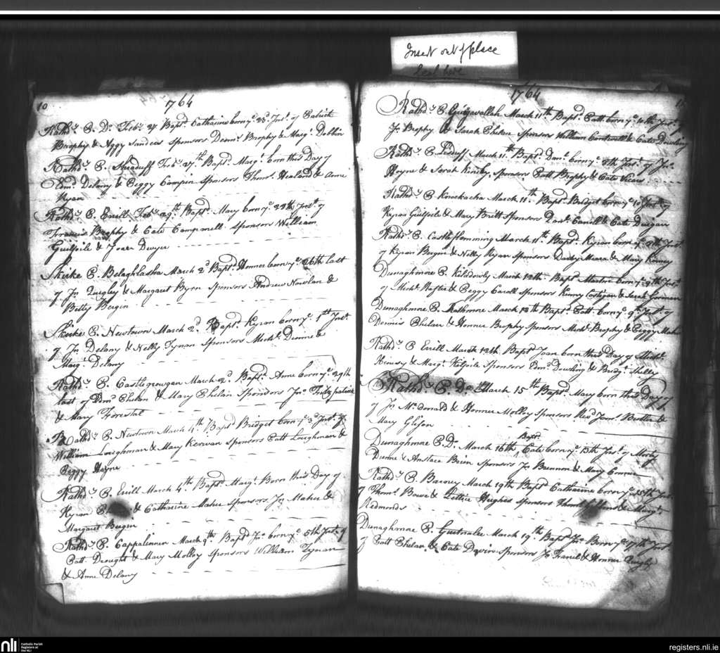 Rathdowney; County of Laois; Diocese of Ossory. Baptisms, Feb. 1764 to Mar. 1764