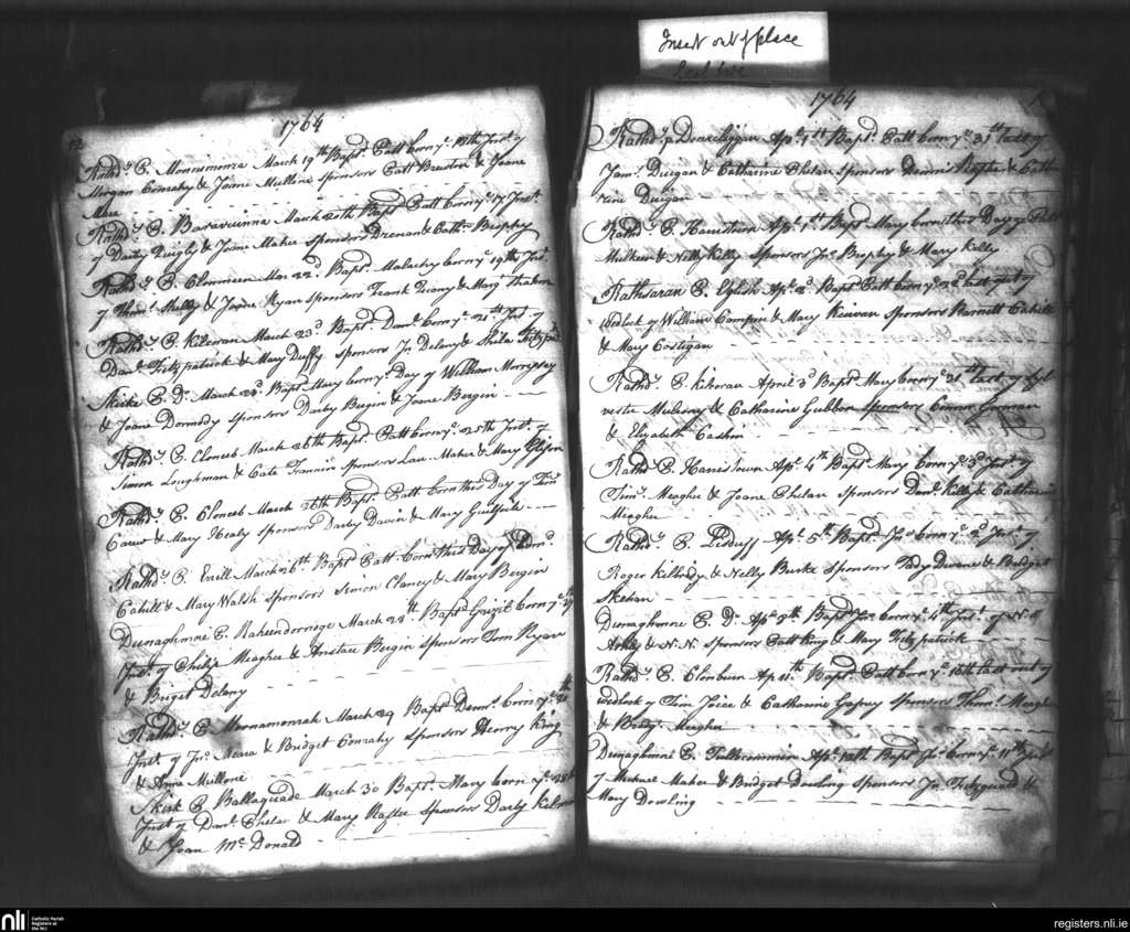 Rathdowney; County of Laois; Diocese of Ossory. Baptisms, Mar. 1764 to Apr. 1764
