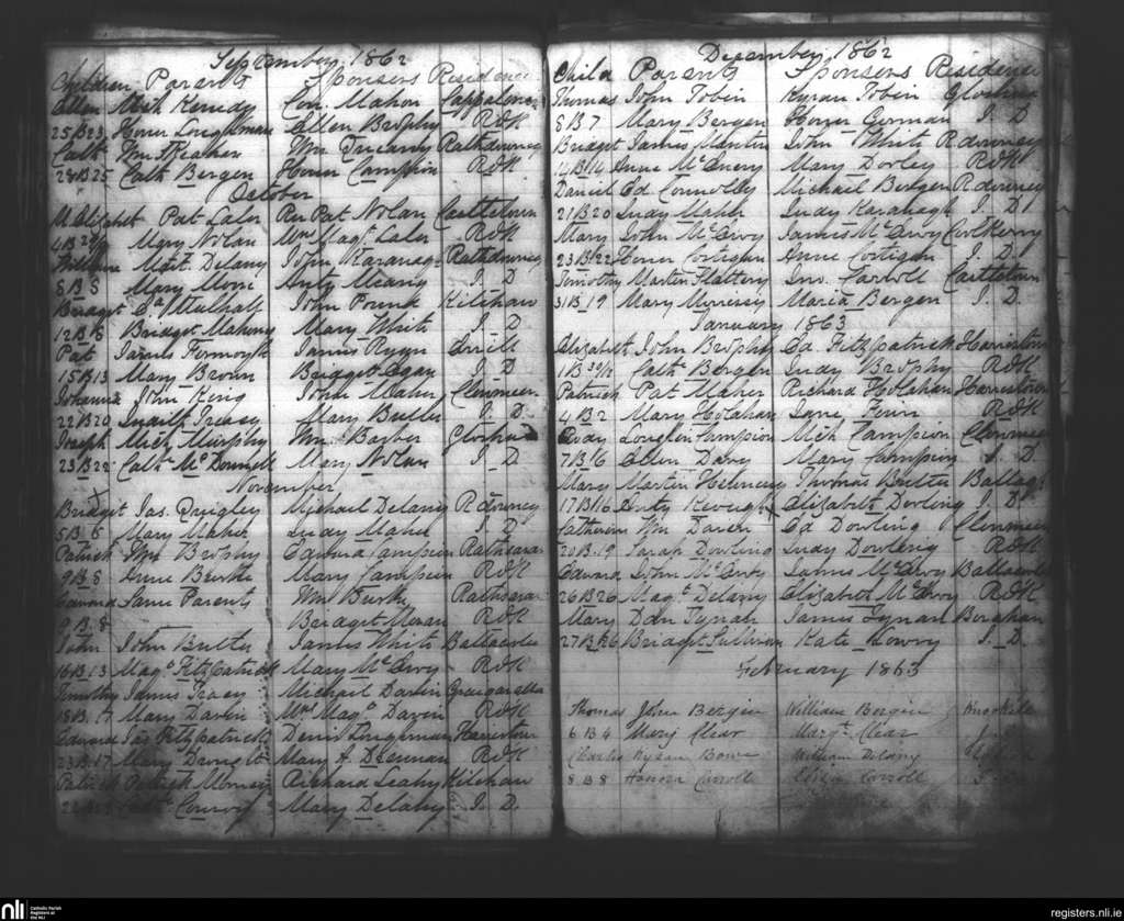 Rathdowney; County of Laois; Diocese of Ossory. Baptisms, Sep. 1862 to Feb. 1863