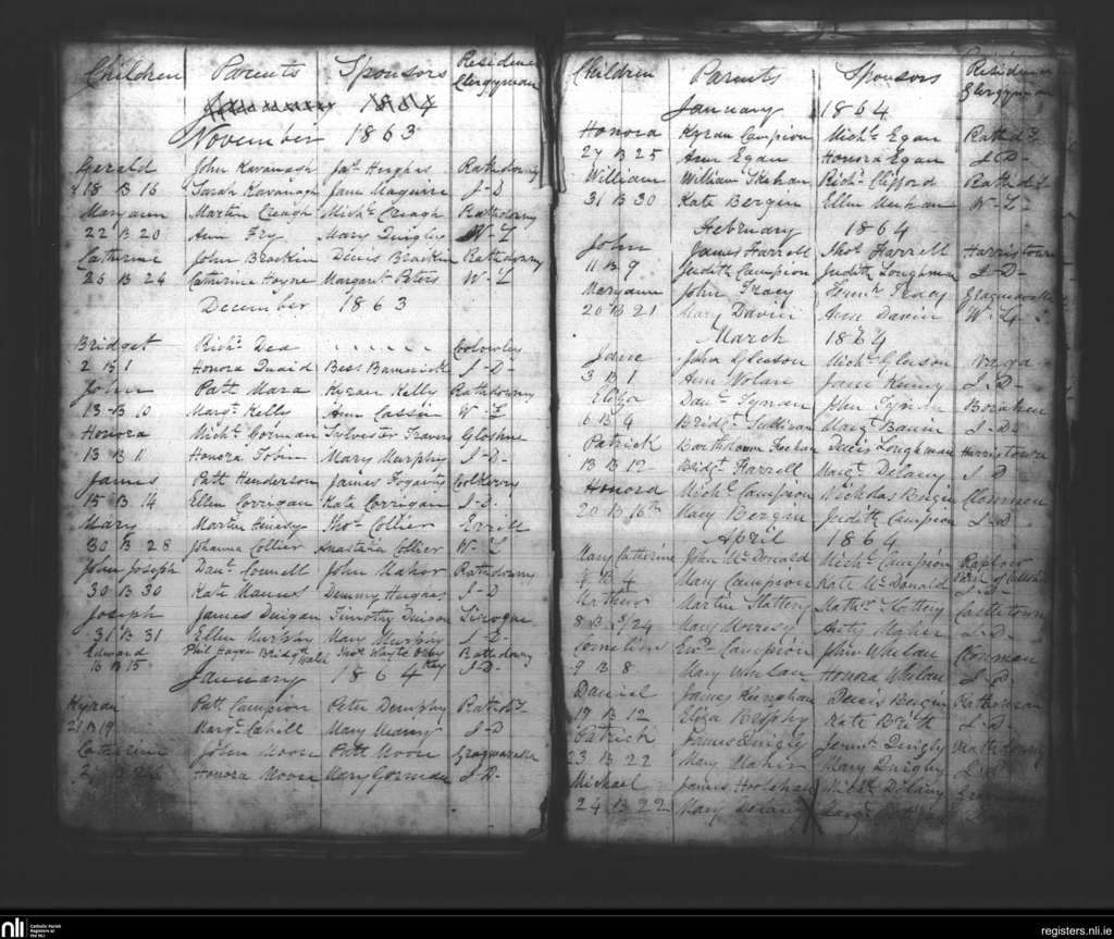 Rathdowney; County of Laois; Diocese of Ossory. Baptisms, Nov. 1863 to Apr. 1864