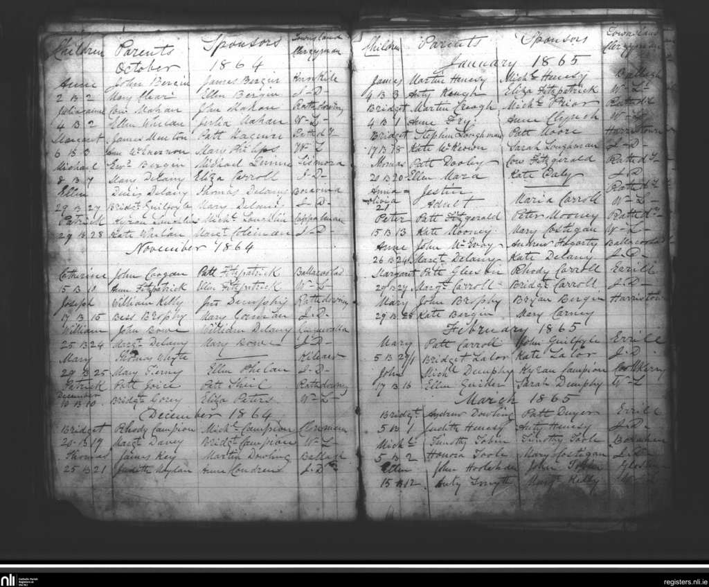 Rathdowney; County of Laois; Diocese of Ossory. Baptisms, Oct. 1864 to Mar. 1865