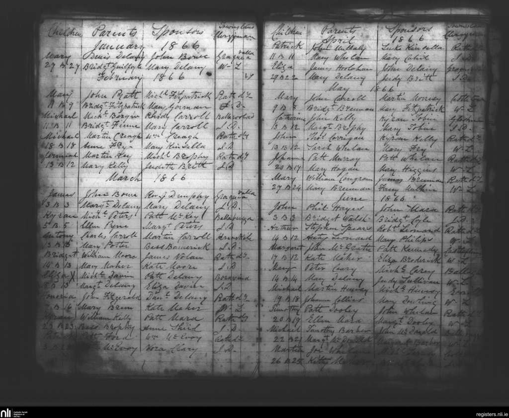 Rathdowney; County of Laois; Diocese of Ossory. Baptisms, Jan. 1866 to June 1866