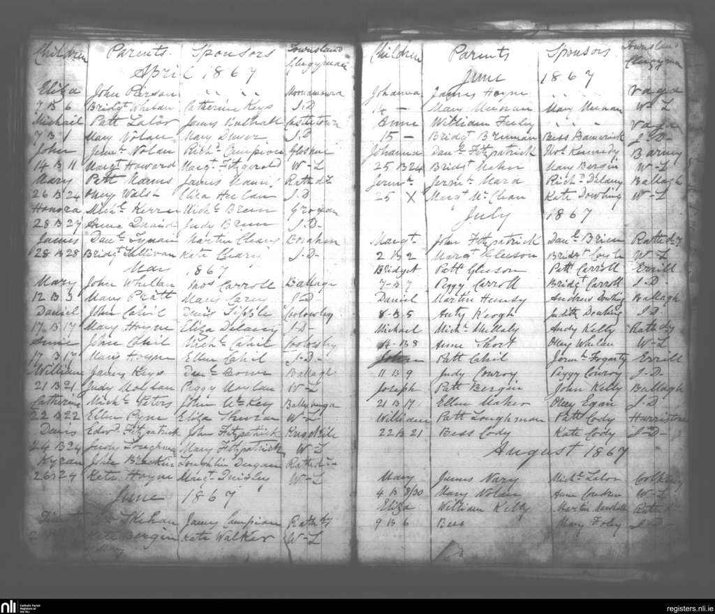 Rathdowney; County of Laois; Diocese of Ossory. Baptisms, Apr. 1867 to Aug. 1867