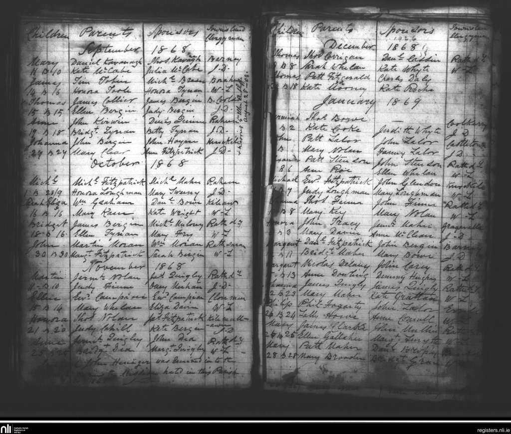 Rathdowney; County of Laois; Diocese of Ossory. Baptisms, Sep. 1868 to Jan. 1869