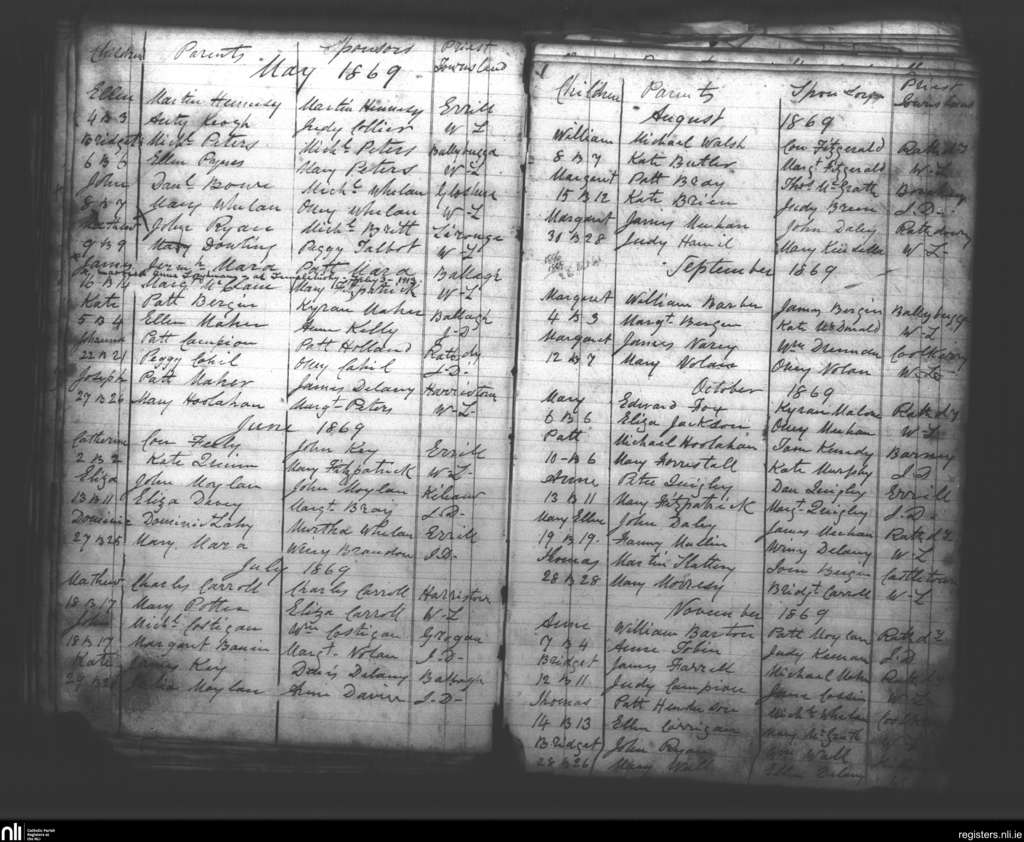 Rathdowney; County of Laois; Diocese of Ossory. Baptisms, May 1869 to Nov. 1869