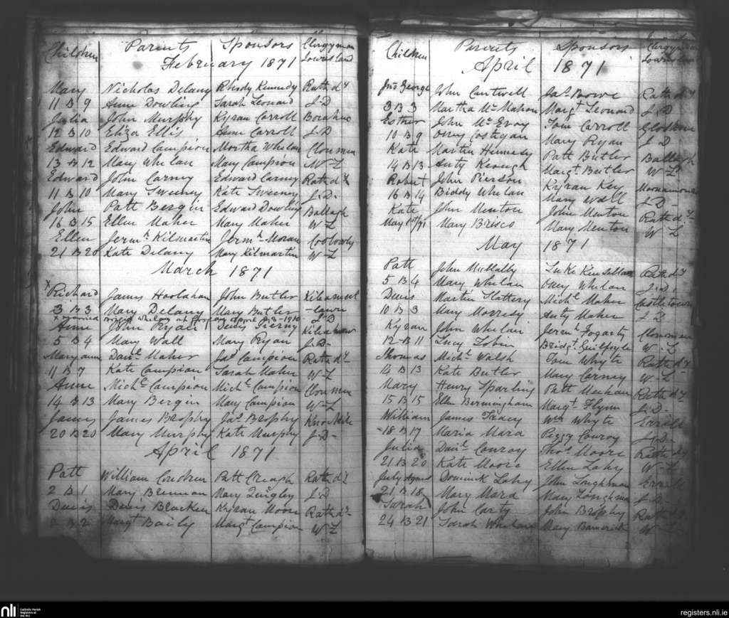 Rathdowney; County of Laois; Diocese of Ossory. Baptisms, Feb. 1871 to May 1871