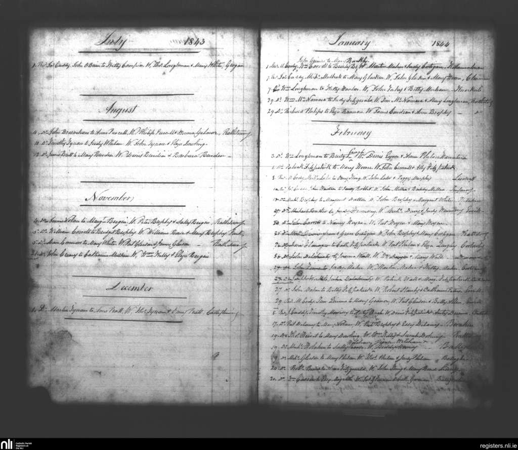 Rathdowney; County of Laois; Diocese of Ossory. Marriages, July 1843 to Feb. 1844