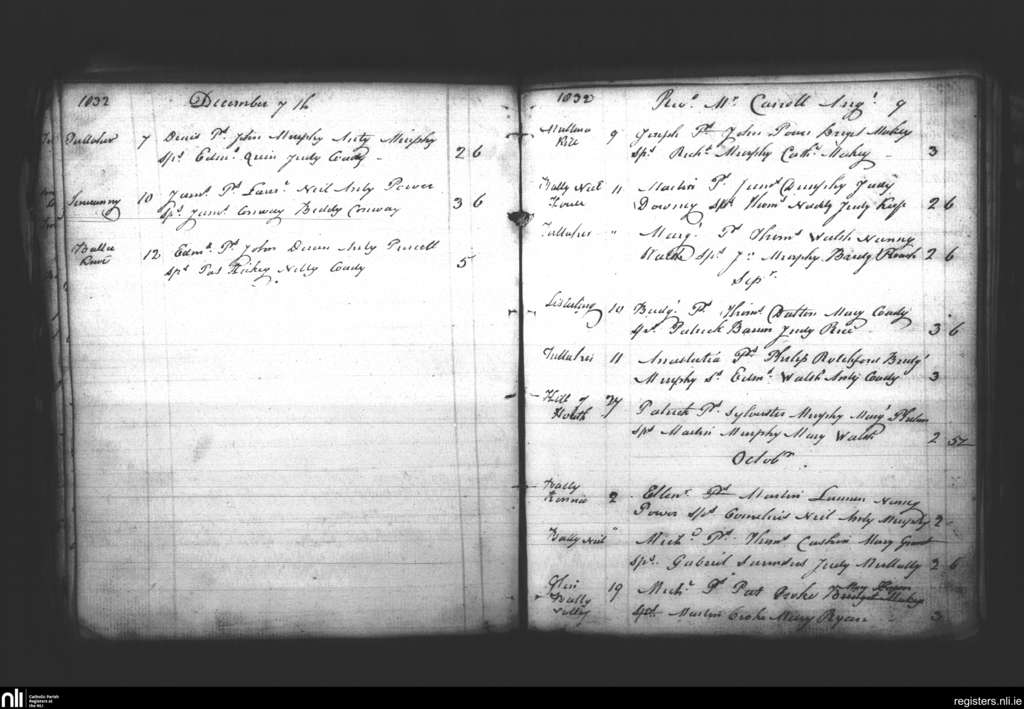 Tullagher; County of Kilkenny; Diocese of Ossory. Baptisms, Sep. 1832 to Dec. 1832