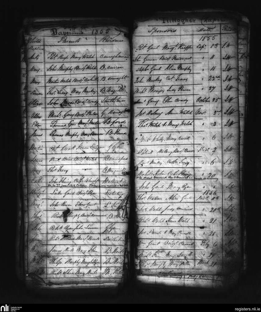 Tullagher; County of Kilkenny; Diocese of Ossory. Baptisms, Sep. 1855 to Mar. 1856