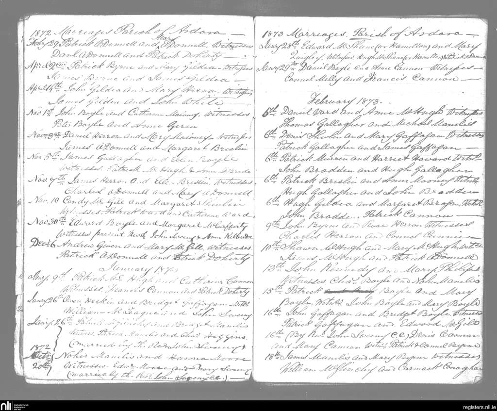 Ardara; County of Donegal; Diocese of Raphoe. Marriages, Feb. 1872 to Feb. 1873
