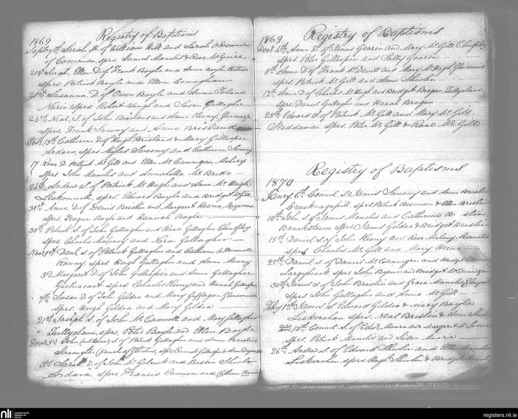 Ardara; County of Donegal; Diocese of Raphoe. Baptisms, Sep. 1869 to Feb. 1870