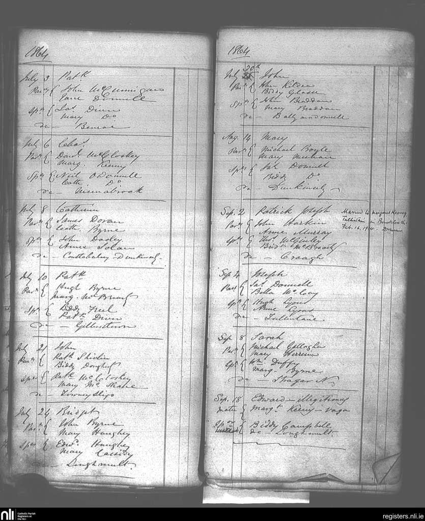 Killaghtee; County of Donegal; Diocese of Raphoe. Baptisms, July 1864 to Sep. 1864
