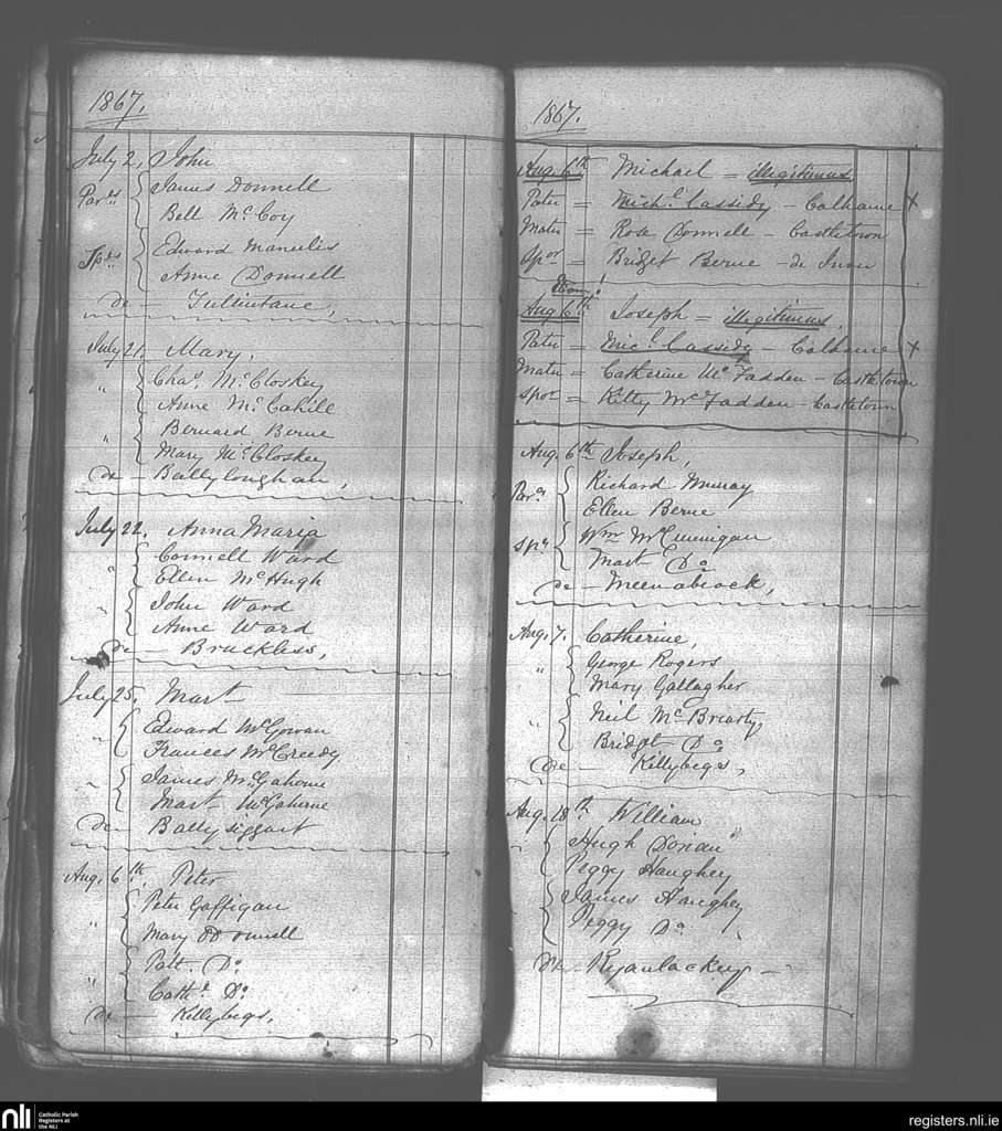 Killaghtee; County of Donegal; Diocese of Raphoe. Baptisms, July 1867 to Aug. 1867
