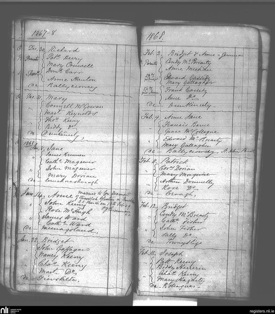 Killaghtee; County of Donegal; Diocese of Raphoe. Baptisms, Dec. 1867 to Feb. 1868