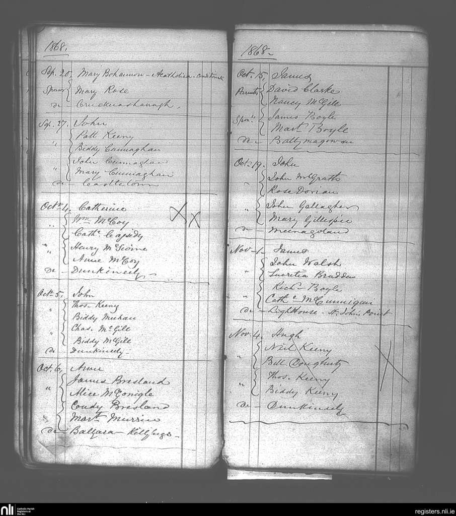 Killaghtee; County of Donegal; Diocese of Raphoe. Baptisms, Sep. 1868 to Nov. 1868