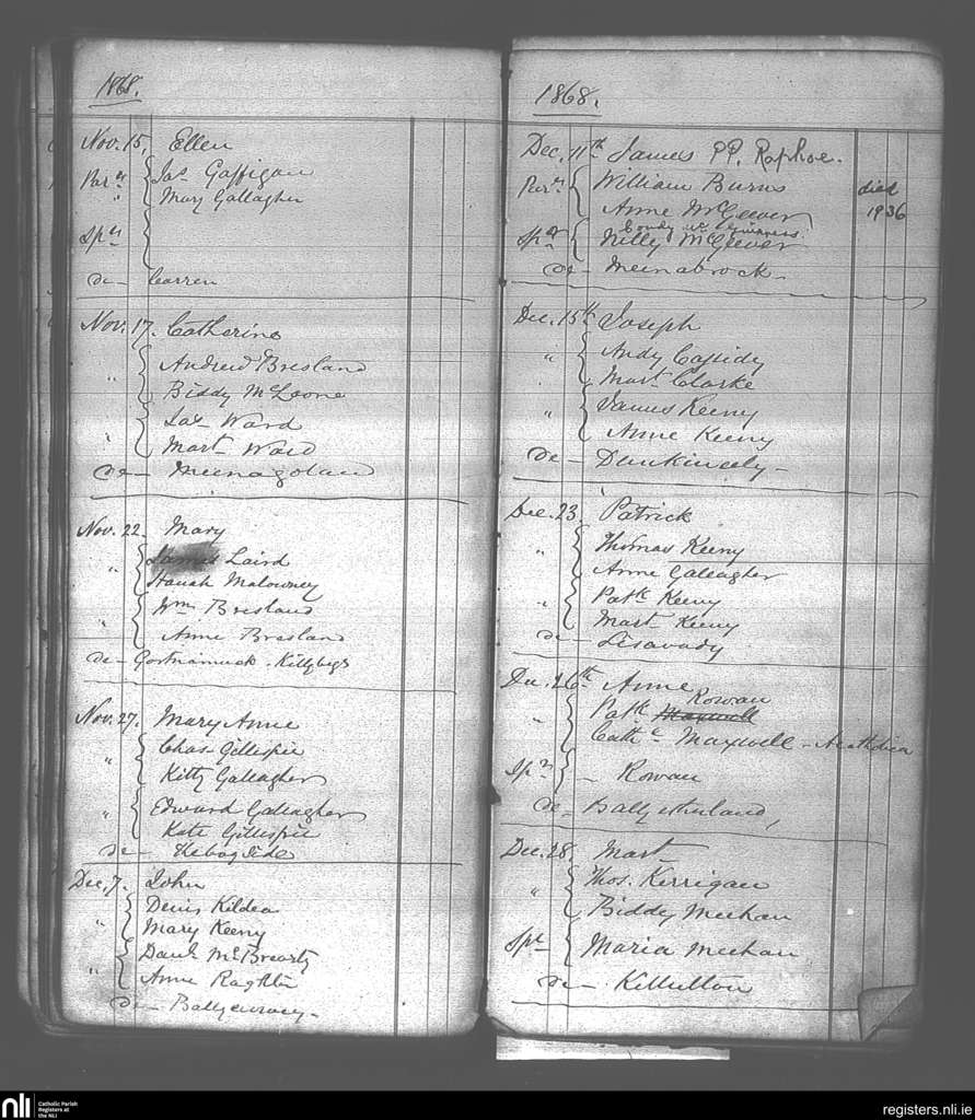 Killaghtee; County of Donegal; Diocese of Raphoe. Baptisms, Nov. 1868 to Dec. 1868