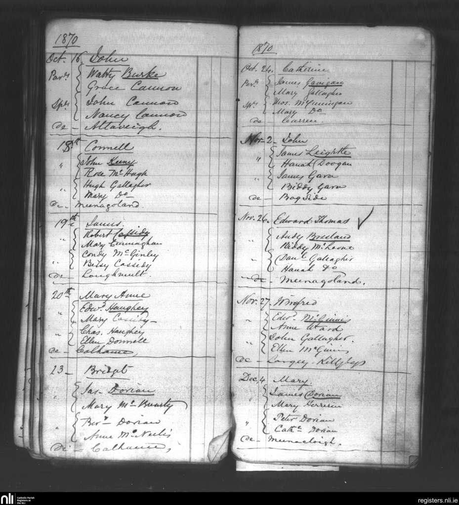 Killaghtee; County of Donegal; Diocese of Raphoe. Baptisms, Oct. 1870 to Dec. 1870