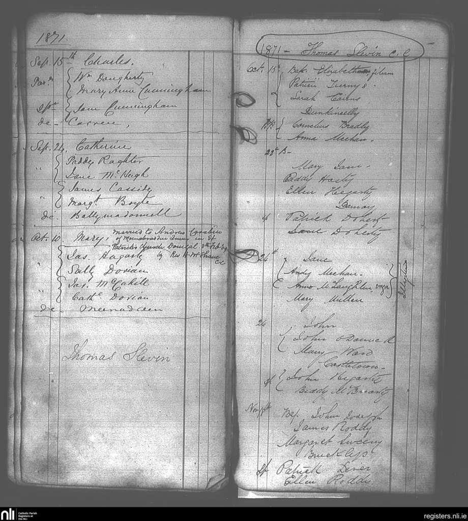 Killaghtee; County of Donegal; Diocese of Raphoe. Baptisms, Sep. 1871 to Nov. 1871