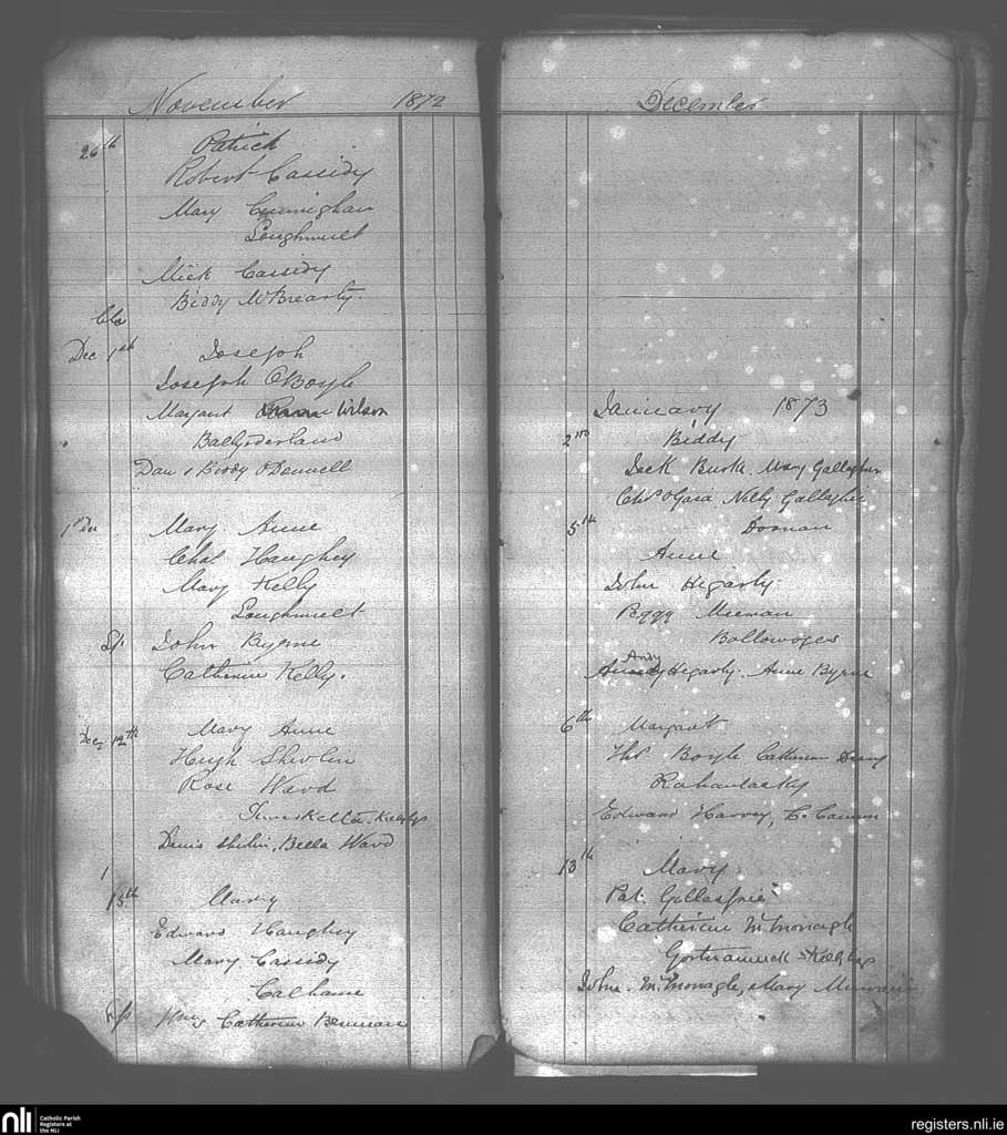 Killaghtee; County of Donegal; Diocese of Raphoe. Baptisms, Nov. 1872 to Jan. 1873
