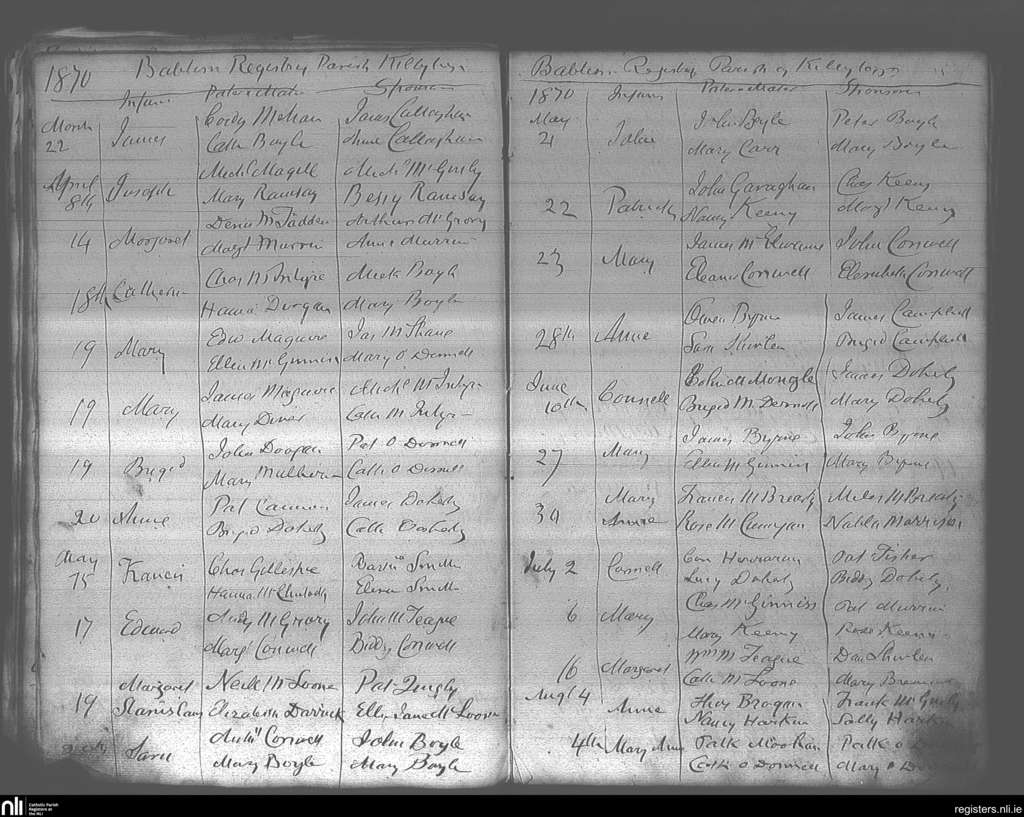 Killybegs; County of Donegal; Diocese of Raphoe. Baptisms, Mar. 1870 to Aug. 1870