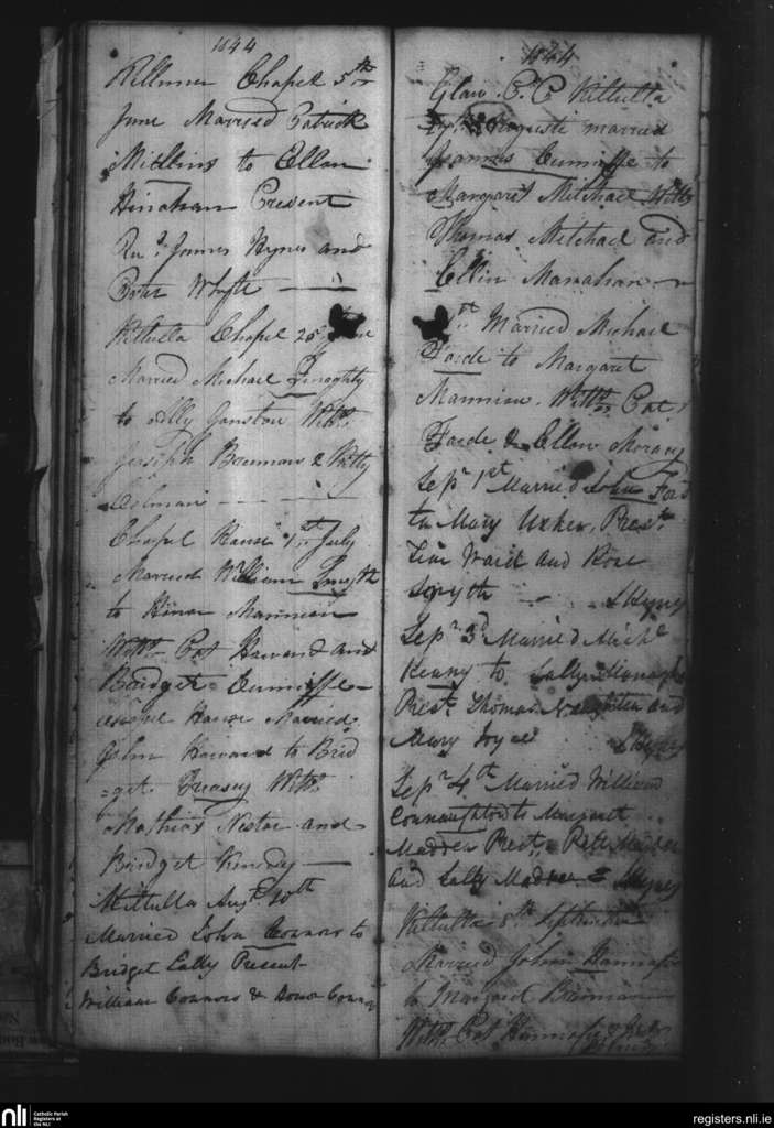 Kiltullagh; County of Galway; Diocese of Clonfert. Marriages, June 1844 to Sep. 1844