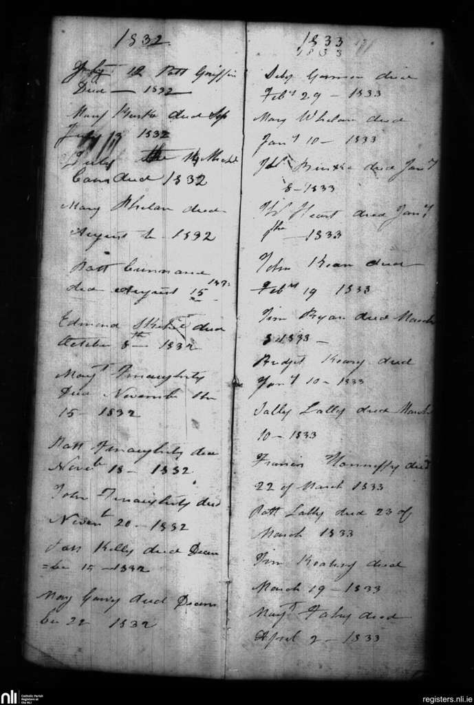 Kiltullagh; County of Galway; Diocese of Clonfert. Deaths, July 1832 to Apr. 1833
