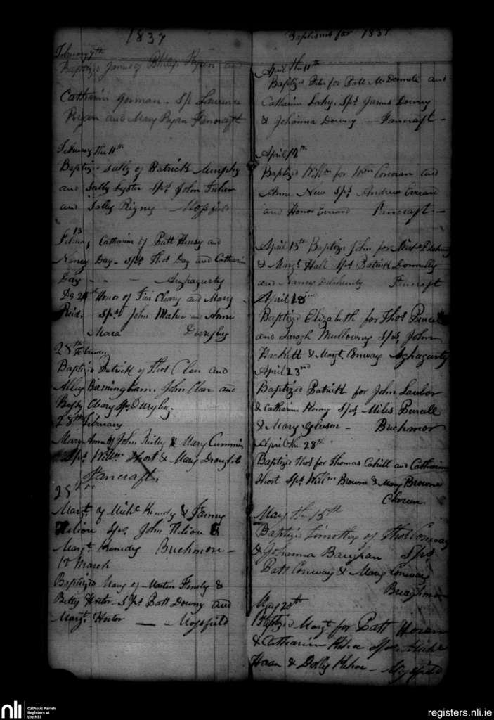 Seirkieran; County of Offaly; Diocese of Ossory. Baptisms, Feb. 1837 to May 1837
