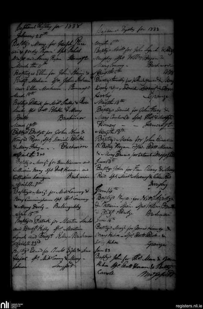 Seirkieran; County of Offaly; Diocese of Ossory. Baptisms, Feb. 1838 to June 1838
