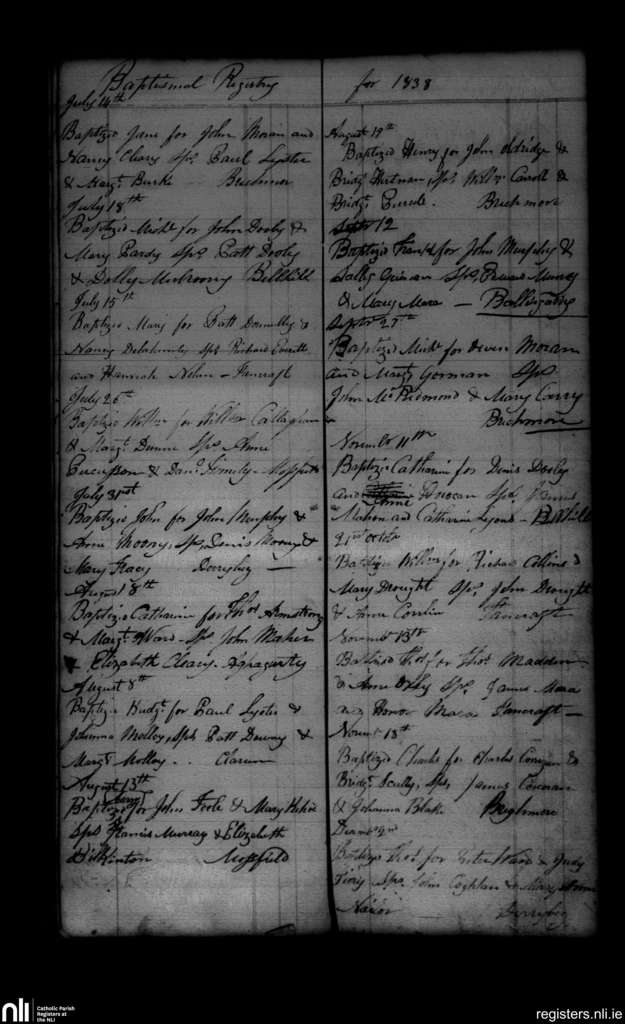 Seirkieran; County of Offaly; Diocese of Ossory. Baptisms, July 1838 to Dec. 1838
