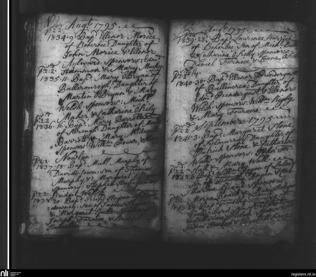 Slieverue; County of Waterford, Kilkenny; Diocese of Ossory. Baptisms, Aug. 1795 to Sep. 1795