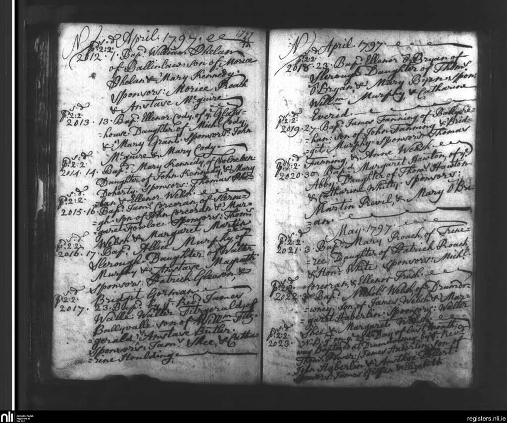 Slieverue; County of Waterford, Kilkenny; Diocese of Ossory. Baptisms, Apr. 1797 to May 1797