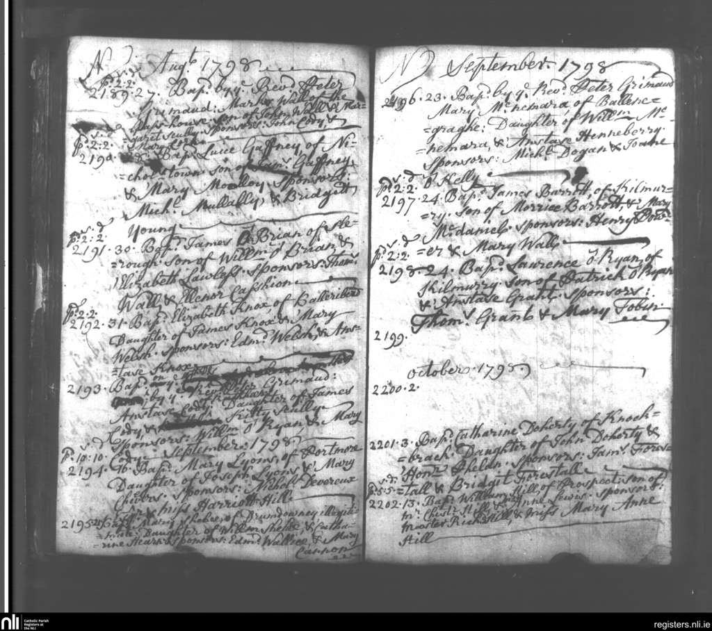 Slieverue; County of Waterford, Kilkenny; Diocese of Ossory. Baptisms, Aug. 1798 to Oct. 1798
