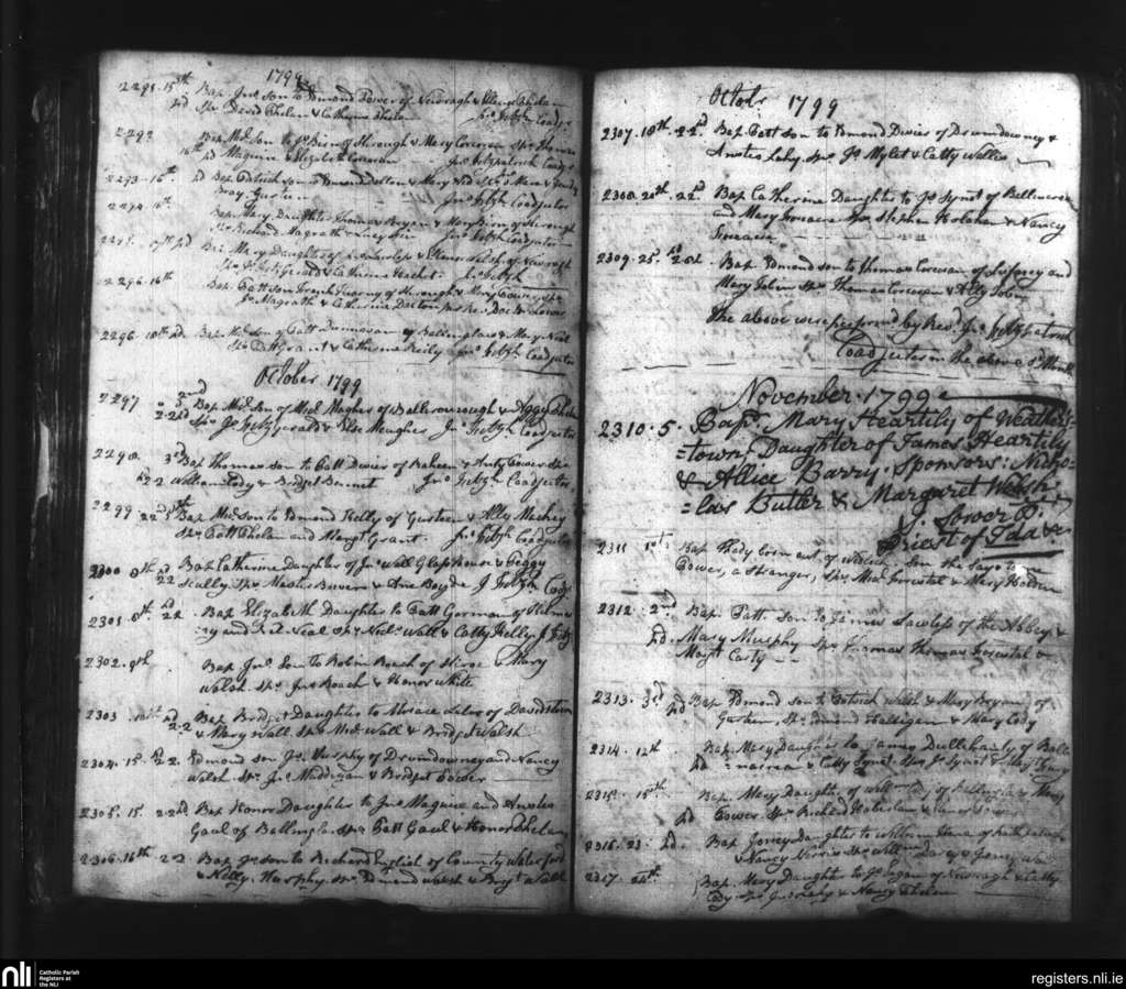 Slieverue; County of Waterford, Kilkenny; Diocese of Ossory. Baptisms, Sep. 1799 to Nov. 1799
