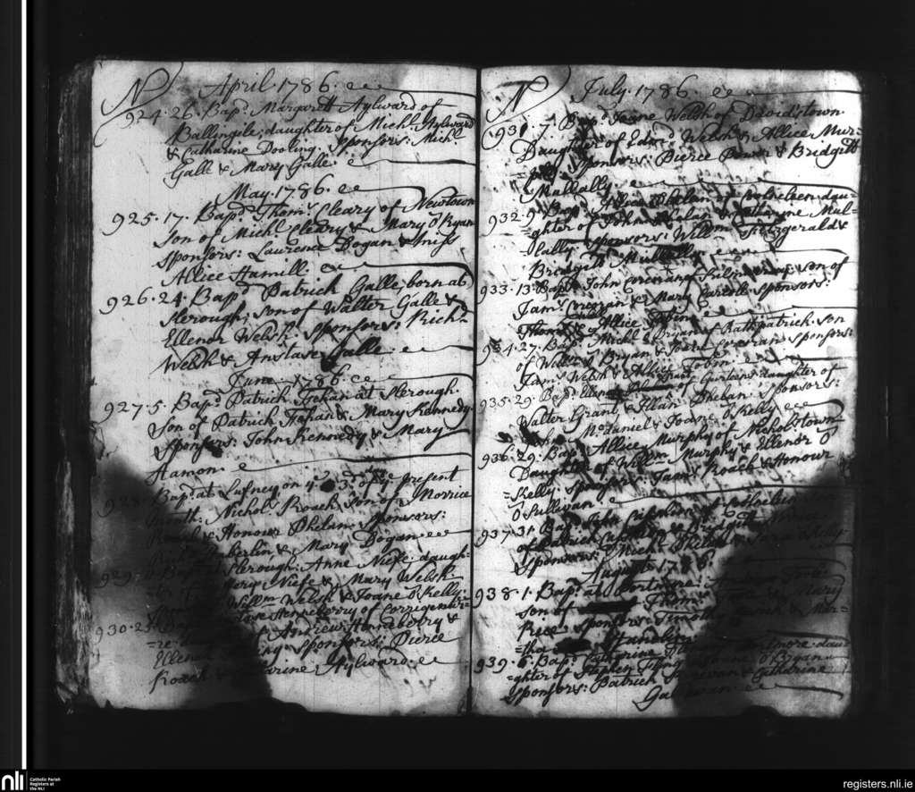 Slieverue; County of Waterford, Kilkenny; Diocese of Ossory. Baptisms, Apr. 1786 to Aug. 1786