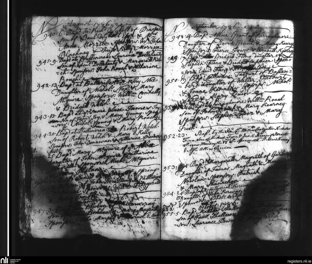 Slieverue; County of Waterford, Kilkenny; Diocese of Ossory. Baptisms, Aug. 1786 to Oct. 1786