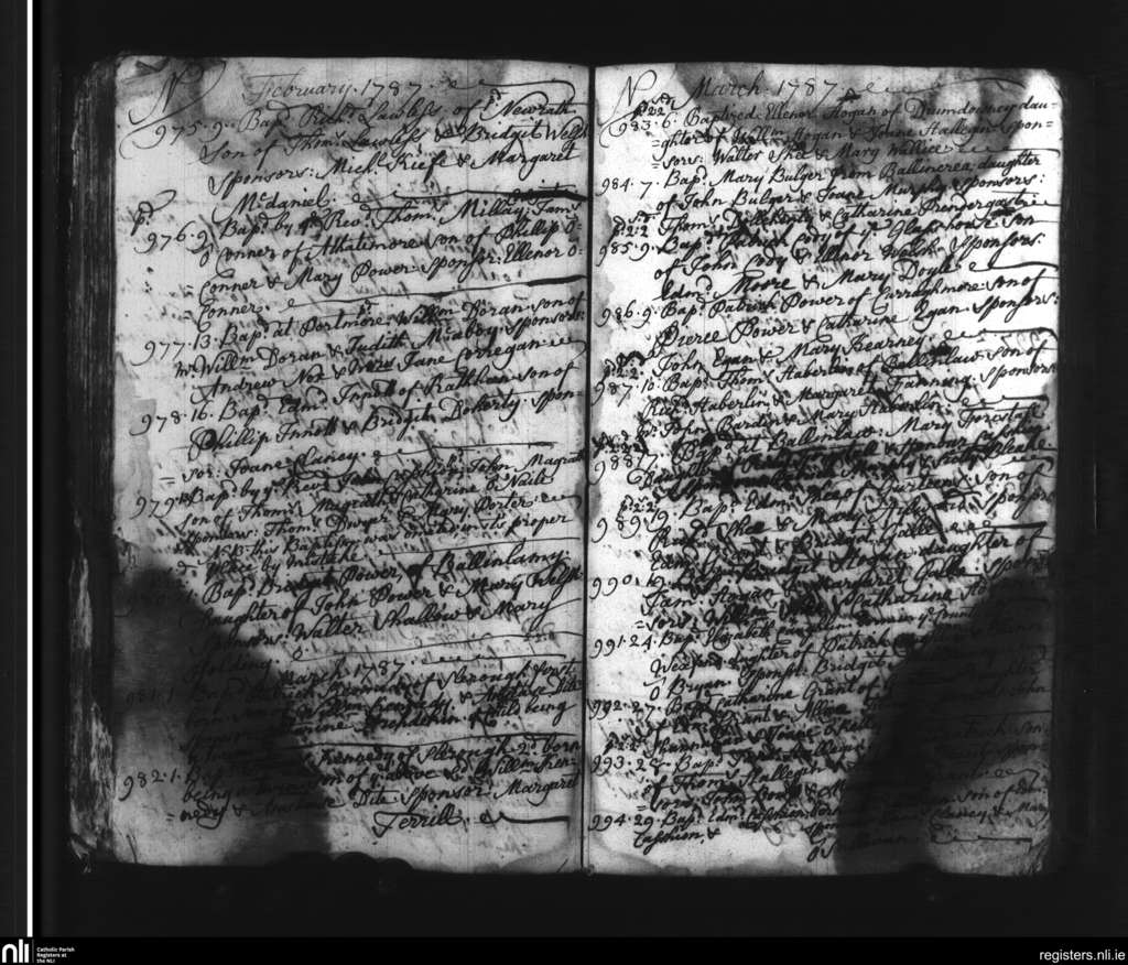 Slieverue; County of Waterford, Kilkenny; Diocese of Ossory. Baptisms, Feb. 1787 to Apr. 1787
