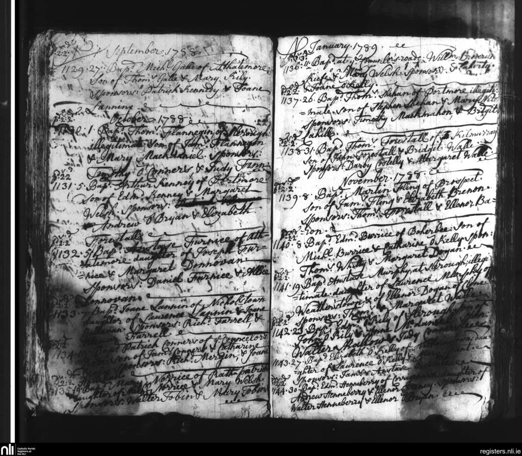 Slieverue; County of Waterford, Kilkenny; Diocese of Ossory. Baptisms, Sep. 1788 to Jan. 1789
