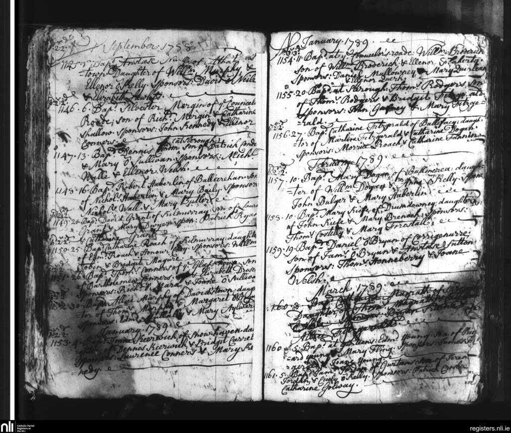 Slieverue; County of Waterford, Kilkenny; Diocese of Ossory. Baptisms, Sep. 1788 to Mar. 1789