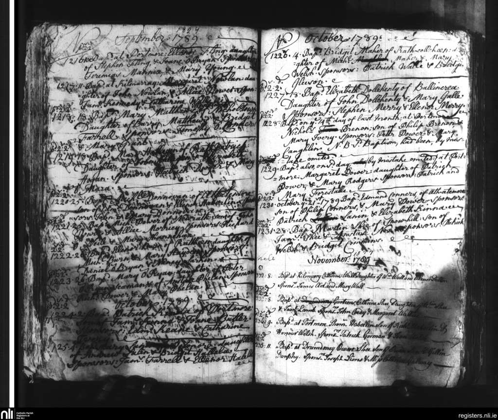 Slieverue; County of Waterford, Kilkenny; Diocese of Ossory. Baptisms, Sep. 1789 to Nov. 1789