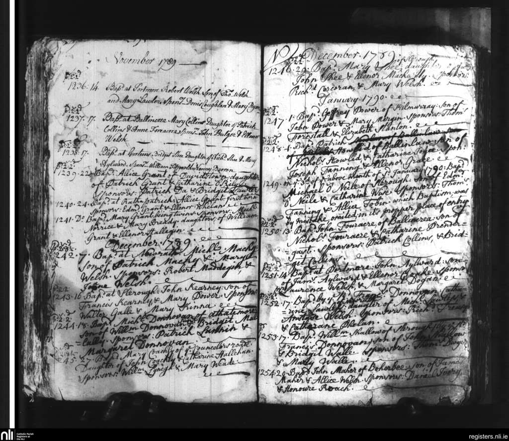 Slieverue; County of Waterford, Kilkenny; Diocese of Ossory. Baptisms, Nov. 1789 to Jan. 1790