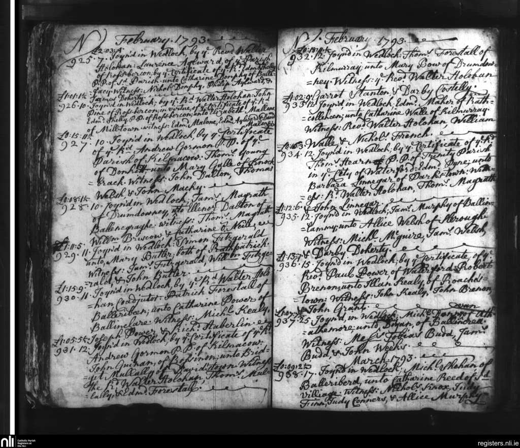 Slieverue; County of Waterford, Kilkenny; Diocese of Ossory. Marriages, Feb. 1793 to Mar. 1793