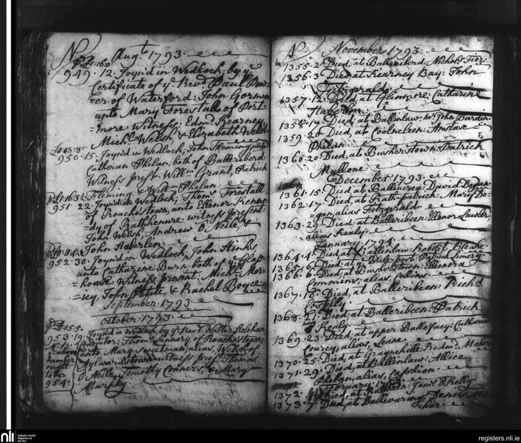 Slieverue; County of Waterford, Kilkenny; Diocese of Ossory. Deaths, Marriages, Aug. 1793 to Feb. 1794