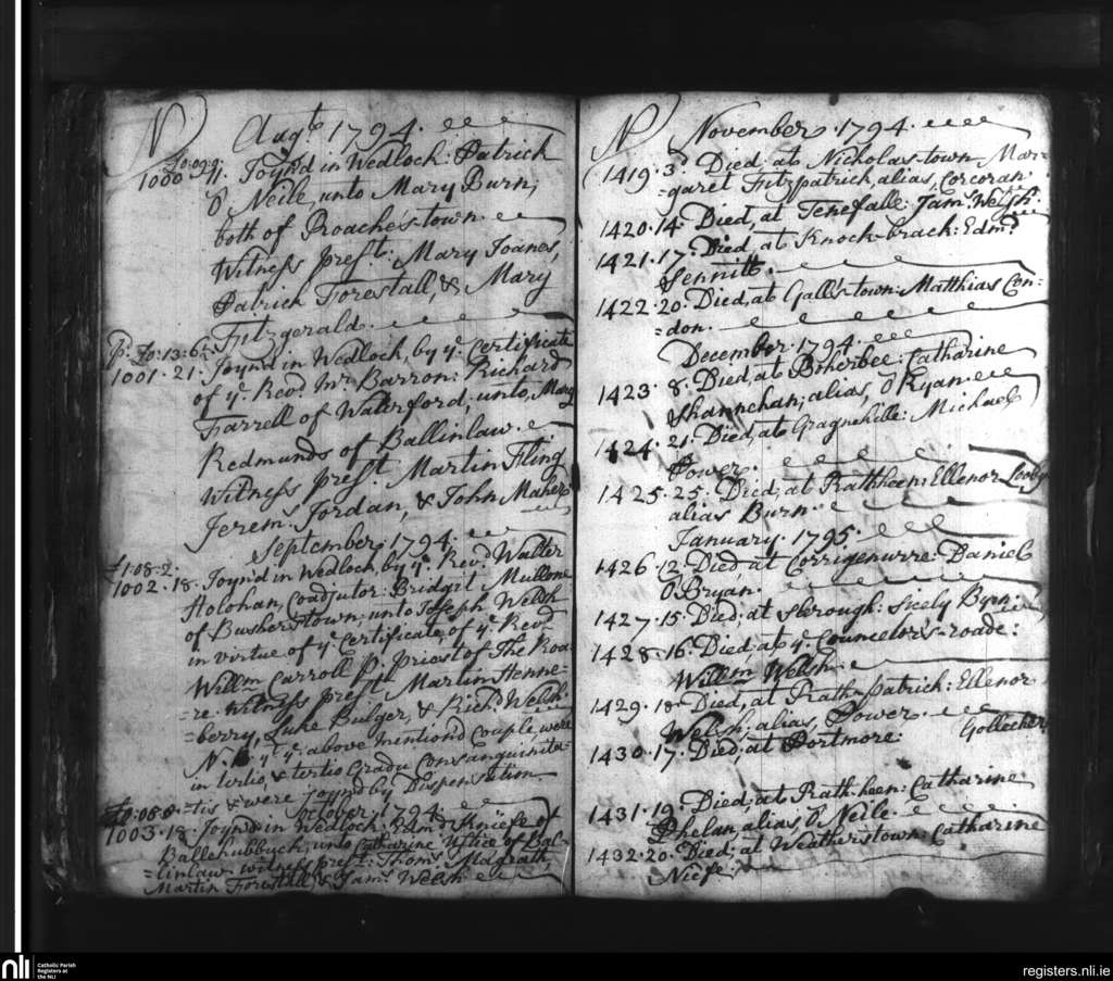 Slieverue; County of Waterford, Kilkenny; Diocese of Ossory. Marriages, Deaths, Aug. 1794 to Jan. 1795