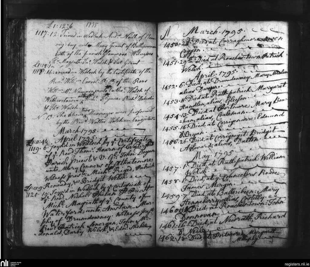 Slieverue; County of Waterford, Kilkenny; Diocese of Ossory. Marriages, Deaths, Feb. 1795 to May 1795